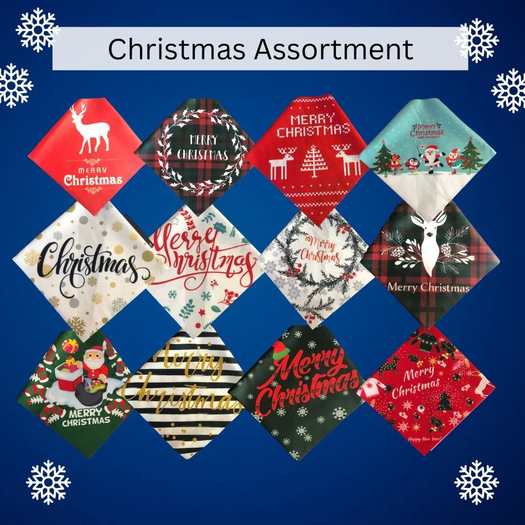 Pack of 2 assorted Christmas bandanas for small to medium dogs. The lightweight woven fabric of 100% polyester can be hand washed if a little dirt gets on them RIGHT before you take the picture. This pack of 2 allows your dogs to coordinate or to have a backup in case one gets messy. Each bandana is approximately 22.8inch/58cm x 15.8inch/40cm x 15.8inch/40cm. Bandanas shown on the dogs are examples from the assortment. Each design is unique.