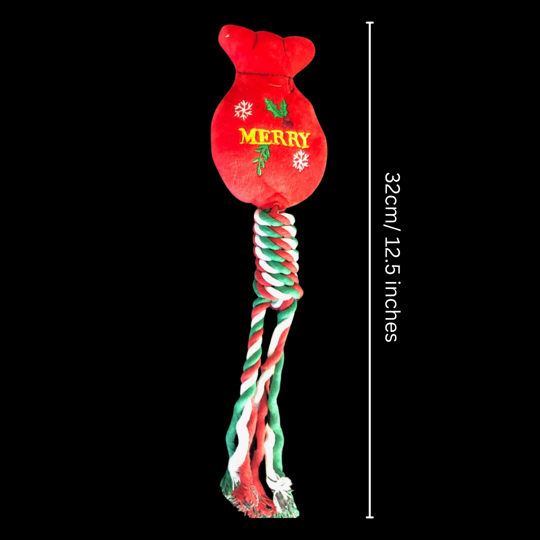 This Santa Toy Bag chew toy with tug rope is perfect for small dogs who are not aggressive chewers. Designed to fit neatly into a holiday stocking or carry in a small purse or backpack, you can take your dogs newest favorite toy with you on car rides. This toy will keep your dog busy while you bake (or eat) cookies, chat with friends or watch TV.