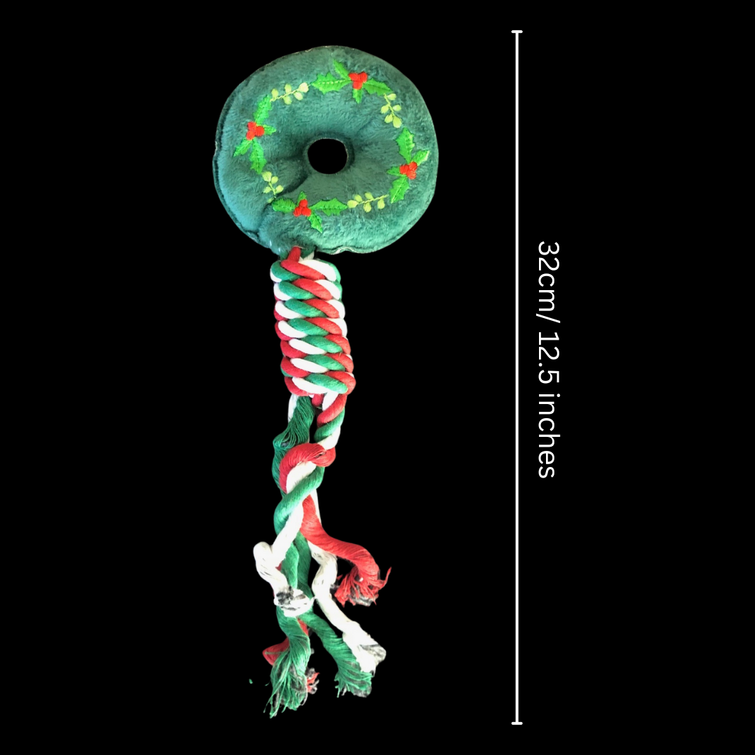 This holiday wreath chew toy with tug rope is perfect for small dogs who are not aggressive chewers. Designed to fit neatly into a holiday stocking or carry in a small purse or backpack, you can take your dogs newest favorite toy with you on car rides. This toy will keep your dog busy while you bake (or eat) cookies, chat with friends or watch TV.