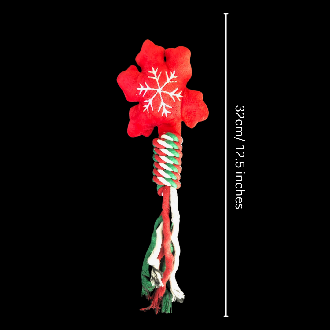 This snowflake chew toy with tug rope is perfect for small dogs who are not aggressive chewers. Designed to fit neatly into a holiday stocking or carry in a small purse or backpack, you can take your dogs newest favorite toy with you on car rides. This toy will keep your dog busy while you bake (or eat) cookies, chat with friends or watch TV.